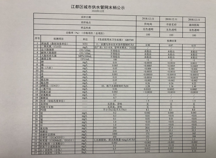 2018年12月江都區城市供水管網末梢公示