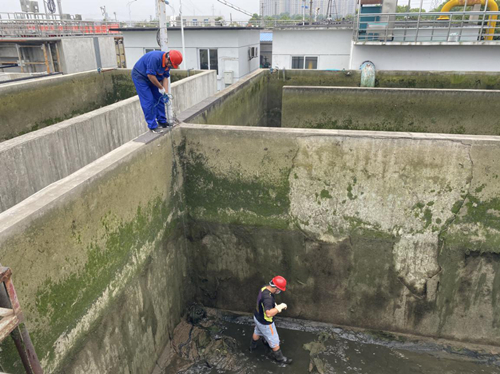 現場工作人員面對高溫天氣,佩戴好安全防護用品,深入貯水池及消毒池池底,不怕臟、不怕累,共同清理青苔、污泥,經過一天的不懈努力,順利完成清淤工作。此次池組清淤工作組織得力,安全有序開展,確保了污水池組的正常運行,保證出水水質穩定達標排放。