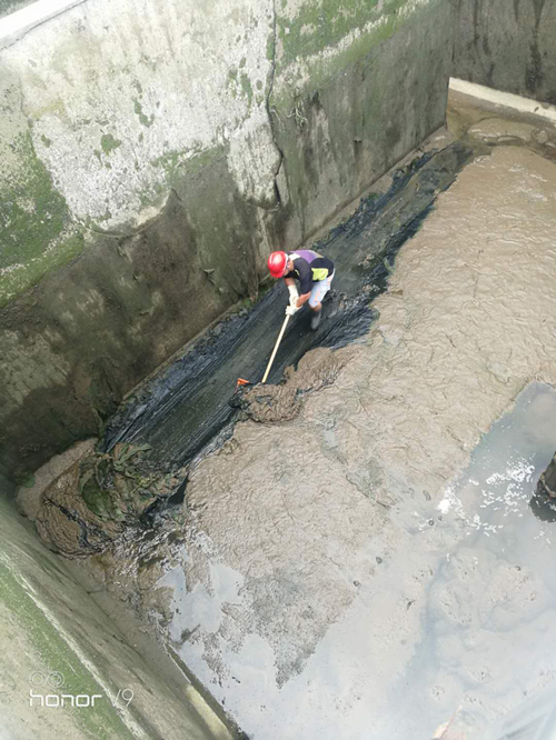 正值梅雨季節,污水廠池組內綠藻、青苔滋生,且受連續多日暴雨影響,導致后道污泥積淤嚴重,影響水質處理效果,為防止池內淤泥沉積過多影響池組的正常運轉,7月8日,我公司運營管理辦公室會同設備管理辦公室,共同研究決定對邵伯油田污水廠開展池組應急清淤工作,公司領導高度重視此次清淤工作,方案確定后,我單位立即展開相關工作,聯合第三方維保單位,在保證生產的前提下,明確分工,并對相關施工安全環節進行嚴密部署,以確保此次清淤工作安全高效完成。