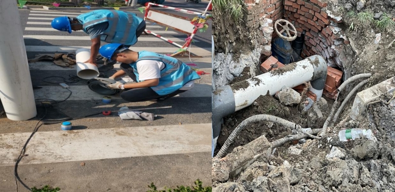 此次維修的是老水廠鋪設的DN200的PVC管道,但在施工過程中遇到了較多困難,當挖掘機破開路面時,發現需要破除80公分左右厚度的混凝土,但中間是DN300的鋼管,漏點卻在鋼管下方的PVC管與球管連接處,這無疑給施工增加了很大的難度。挖掘機施工時,稍有不慎就會破壞中間鋼管,只能通過手動一邊用風鎬、洋鎬等進行破碎,一邊用鐵鍬進行開挖,同時還需要抽水作業。由于當天室外氣溫高達34攝氏度,烈陽高照,汗水早已浸濕了現場施工人員的衣服,但他們不怕苦、不怕累,克服各種困難,通過3個小時不間斷地搶修,最終完成這段老舊管道的維修更換。