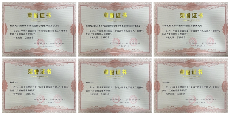近日,揚(yáng)州龍川水務(wù)榮獲多項(xiàng)榮譽(yù)表彰——揚(yáng)州市江都區(qū)文明辦、揚(yáng)州市江都區(qū)建設(shè)全國(guó)文明城市指揮部辦公室聯(lián)合授予揚(yáng)州龍川水務(wù)客戶服務(wù)部客服大廳、下屬自來(lái)水公司營(yíng)業(yè)所繳費(fèi)大廳、下屬惠民公司仙女供水管理所張綱營(yíng)業(yè)廳“文明有禮示范窗口”榮譽(yù)及公司員工佴玲玲、韓紅葉、胡恒晶“文明有禮服務(wù)標(biāo)兵”稱號(hào)。