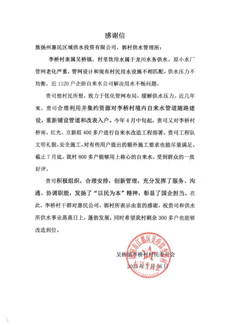 捧著這封沉甸甸的感謝信,惠民區(qū)域供水公司負(fù)責(zé)人蔣珀表示,收到這封感謝信既是肯定也是鞭策。目前李橋村自來水改造項(xiàng)目還在實(shí)施中,預(yù)計(jì)今年10月底竣工,改造工程完工后,李橋村的自來水供水能力和水質(zhì)將得到顯著提升,能夠徹底解決村民的用水“煩心事”,村民的認(rèn)可就是我們工作的最大動力,保障群眾用上“放心水、滿意水”是我們的職責(zé)所在。今后,惠民區(qū)域供水公司將繼續(xù)聚焦群眾用水需求,不斷提升供水服務(wù)質(zhì)量,讓更多群眾享受到更為優(yōu)質(zhì)、便捷的供水服務(wù),讓更多村組享受到優(yōu)質(zhì)的供水服務(wù),把民生工程做到群眾心坎上。用實(shí)際行動踐行“為民辦實(shí)事”的承諾。